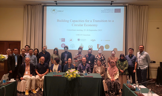 Dự án “Xây dựng năng lực chuyển đổi sang kinh tế tuần hoàn” (CEBCAT) do Liên minh Châu Âu tài trợ và Đại học Santiago de Compostela (Tây Ban Nha) điều phối. Từ ngày 22 đến 26/9/2025, đoàn công tác Học viện Nông nghiệp Việt Nam đã tham dự chương trình trao đổi nghiên cứu tại thủ đô Viêng Chăn (Lào). Sự kiện có sự tham gia của các trường đại học quốc tế như Đại học Santiago de Compostela (Tây Ban Nha), Đại học Thessaly (Hy Lạp) cùng một số trường đại học và viện nghiên cứu châu Âu. Ở khu vực Đông Nam Á, dự án CEBCAT quy tụ 06 trường đại học của ba quốc gia, gồm: Học viện Nông nghiệp Việt Nam và Đại học Bách khoa Hà Nội (Việt Nam); Đại học Quốc gia Lào và Đại học Savannakhet (Lào); Đại học Sebelas Maret và Đại học Nông nghiệp Bogor – IPB (Indonesia). Sự hợp tác này góp phần tăng cường gắn kết học thuật, thúc đẩy chia sẻ kinh nghiệm quốc tế và nâng cao năng lực chuyển đổi sang kinh tế tuần hoàn trong giáo dục đại học khu vực.