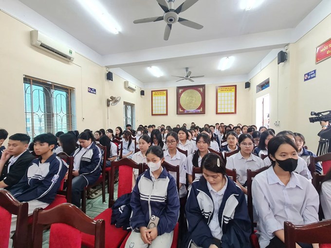 Các em học sinh Trường THPT Kim Thành chăm chú lắng nghe tham luận của các chuyên gia đến từ Học viện Nông nghiệp Việt Nam.